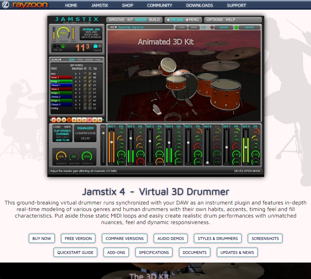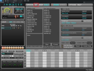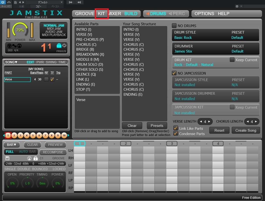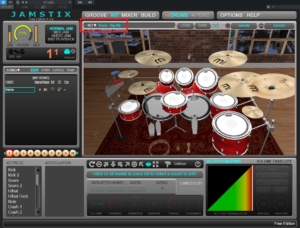 『Jamstix 4 Free』はフリーバージョンとは思えない良いドラム音で、ドラムセットも充実しているので、フリーでもかなり複雑なロックドラムでも音楽制作が行えます。