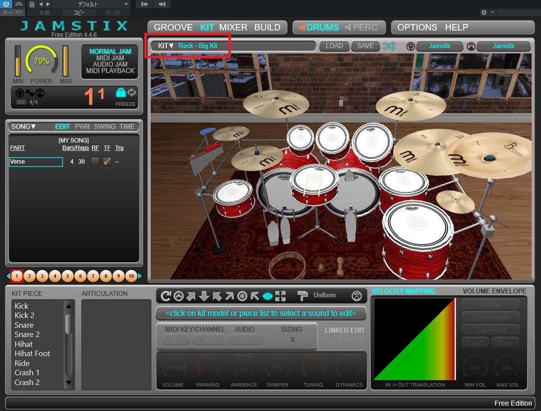 ちなみに私は、今のところFreeバージョンの『Jamstix 4』では『Rock – Big Kit』で音楽制作しています。