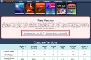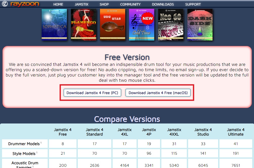 『Download Jamstix 4 Free (PC)』と『Download Jamstix 4 Free (macOS)』というボタンがあるので、ご自身のパソコンの環境に応じてダウンロードします。