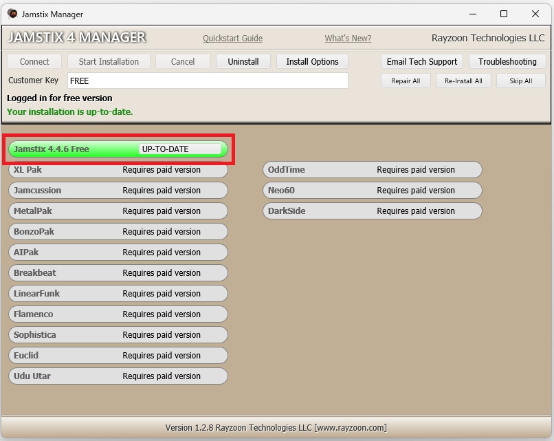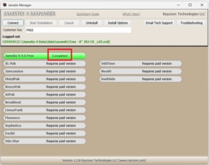 インストールが開始され、完了すると『Jamstix 4 Free 4.x.x』の欄の『INSTALL』欄が『Completed』に変わればインストール完了です。