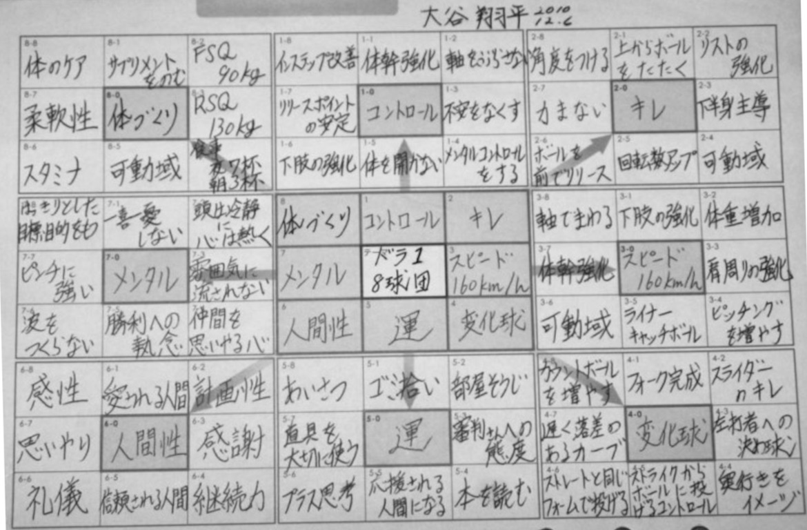 また、大谷翔平の9マスシート(マンダラート)は有名ですよね。