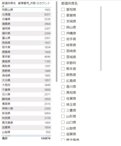 と入力した列が現れ、都道府県ごとに郵便番号の何件が表示されます。