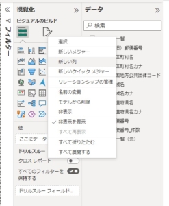 新しい列は、右側のデータ欄のテーブル名を右クリックするとメニューが出てくるので、「新しい列」を選択します。