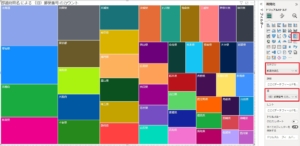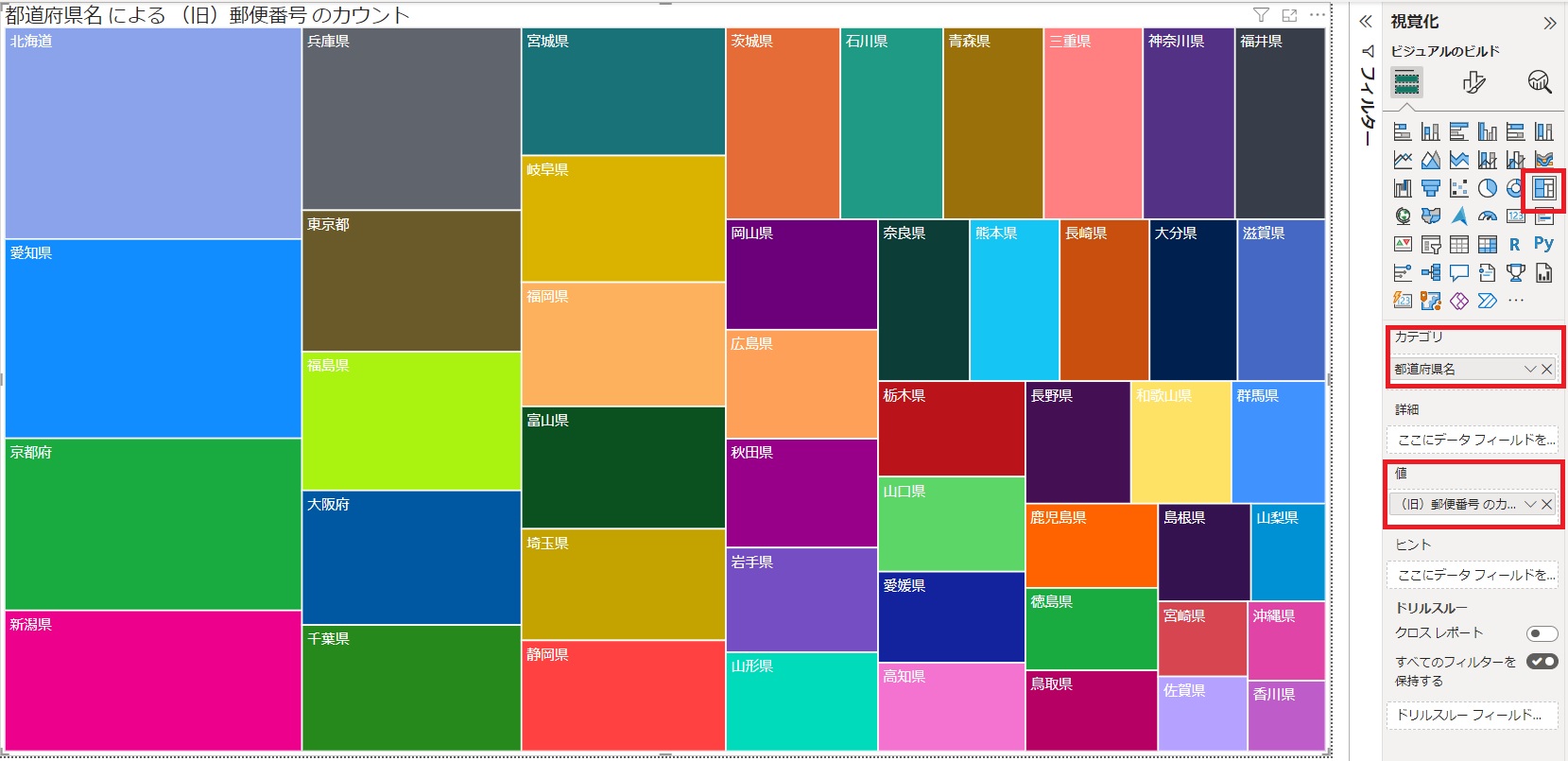 上記は、サンプルデータとして、都道府県別に郵便番号一覧から多い順にツリーマップを作成したものです。