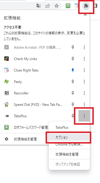 設定の変更方法は、ブラウザの「拡張機能」アイコンから「TabsPlus」プラグインのオプションを開きます。