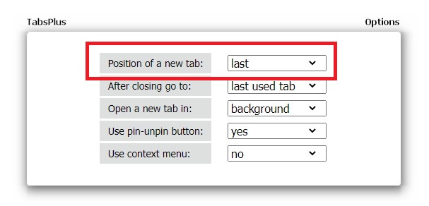 オプションの画面で、「Position of a new tab:」の項目を「last」に変更します。