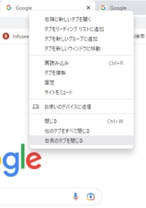 この固定タブも閉じてしまう仕様が嫌だという人は、Chromeの機能でも右側のタブを閉じることが出来ます。
