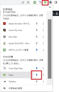という場合には、ブラウザの「拡張機能」アイコンからプラグインを探してピン止めを行ってください。