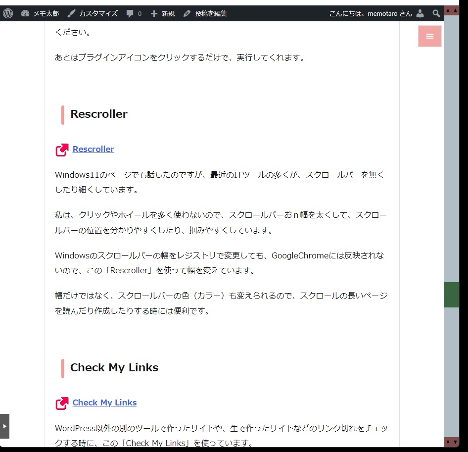 Windowsのスクロールバーの幅をレジストリで変更しても、GoogleChromeには反映されないので、この「Rescroller」を使って幅を変えています。