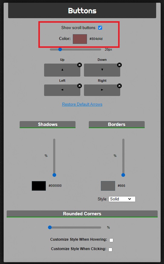 デフォルトではスクロールバーの上下移動ボタンが表示されていないので、私は「Show scroll buttons:」にチェックを入れてボタン表示させ、色の設定も変更しています。