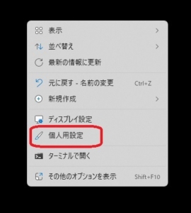適当にデスクトップの背景などを右クリックしてメニューを出すと、「個人設定」という項目があるので選択します。