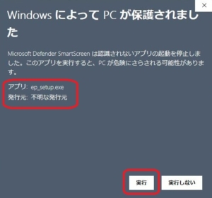 インストールを始めると、セキュリティ警告のような画面が出てきますが、「詳細情報」を開くと実行ボタンが出てくるので、そのまま進んでください。