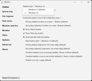 この画面の一番上にある、「Taskbar Style*: Windows 10」という文字のところをクリックすると、設定をWindows11に戻すことができます。