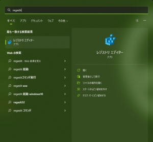 タスクバーのウィンドウズメニューを開いて、検索欄に「regedit」と入力します。