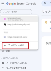 上記のサーチコンソールへのリンクより、サーチコンソールのトップ画面を表示、または左上の方にあるプロパティ検索のプルダウンより『プロパティを追加』のリンクをクリックします。