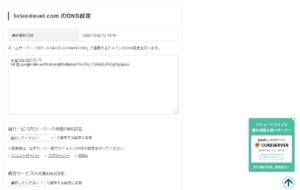 開いた画面の『ネームサーバー~~~DNS設定を行います。』という入力ボックスにDNSコードを入力します。