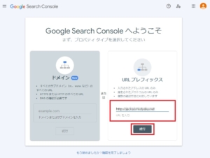 『URLプレフィックス』の方で、URL入力欄に、サイトまたは無料ブログのURLを入力し、『続行』ボタンをクリックします。