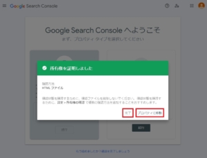 正常にサイトの所有確認が完了した場合には、『所有権を証明しました』という表示が出るので、『完了』ボタンか『プロパティへ移動』ボタンをクリックします。