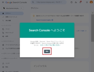 『Search Console へようこそ』の表示が出るので、『開始』ボタンをクリックします。