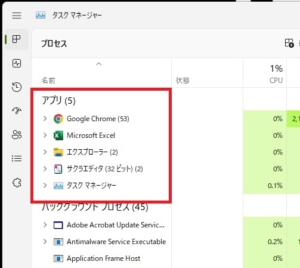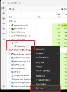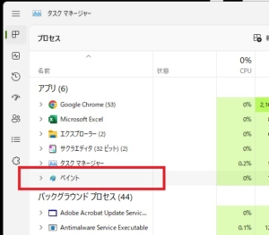 すると、タスクマネージャーのメニューのアプリの項目のところに『ペイント』が追加表示されます。