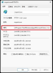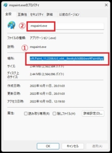 上記の画像では、①が『場所』、②が『ファイル名』になるので、その2つを繋げてMSペイントのファイルがある場所のアドレスを作成します。