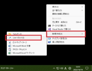 さらにメニューが出てくるので、『新規作成 > ショートカット』をクリックします。